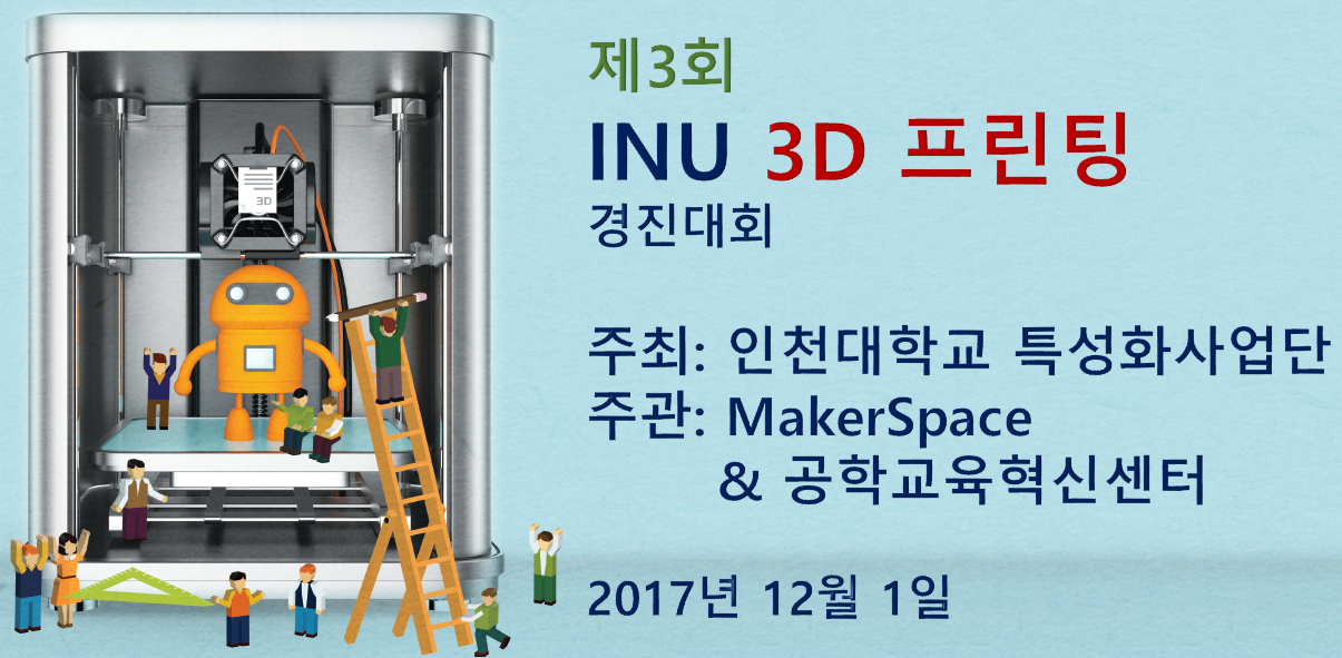 2017학년도 수도권 특성화 사업의 일환으로 인천대학교 메이커스페이스(MakerSpace)에서는 학부 재학생을 대상으로 제3회 INU 3D 프린팅 경진대회를 개최합니다.