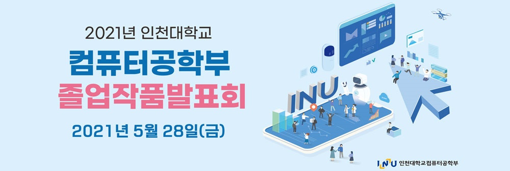 인천대학교 컴퓨터공학부에서는 2021학년도 4학년 학부생(주/야간)을 대상으로 4년간 이수한 교육과정을 통해 개인의 능력 향상 및 결과를 보여줄 수 있는 졸업작품발표회를 개최합니다.