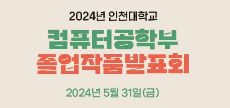 인천대학교 컴퓨터공학부에서는 2024년도 3~4학년 학부생(주/야간)을 대상으로 3~4년간 이수한 교육과정을 통해 개인의 능력 향상 및 결과를 보여줄 수 있는 졸업작품발표회를 개최합니다.